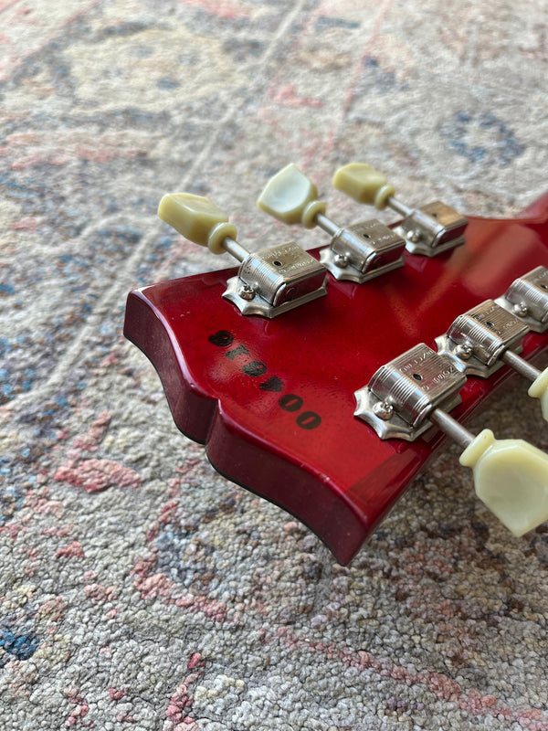 The main thing to note is, the finish has started to check. These models we prone to check on the headstock, if you look for standards and classics in the 90's and early 00's you will struggle to find headstocks that don't have lacquer checking.